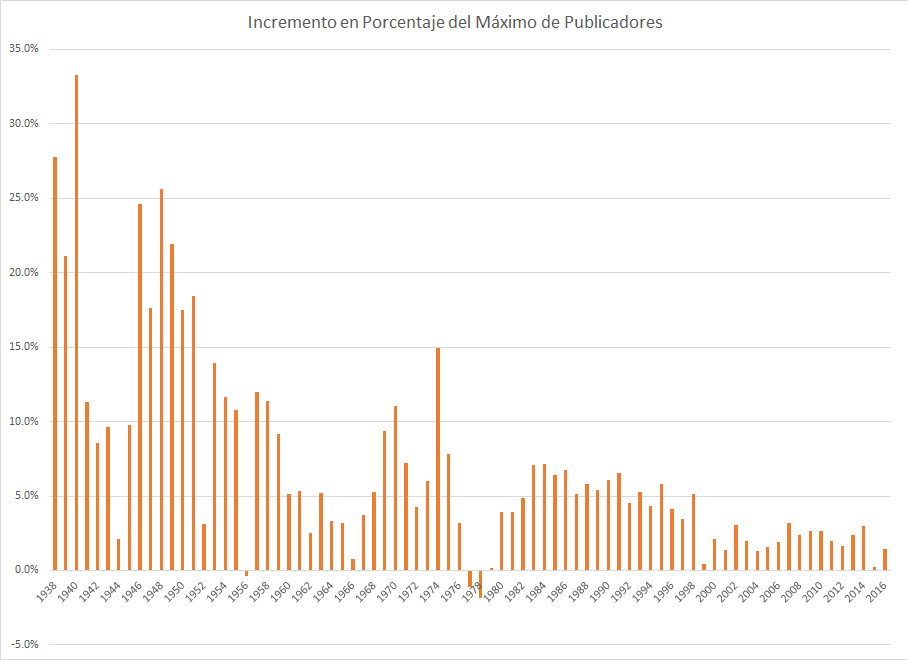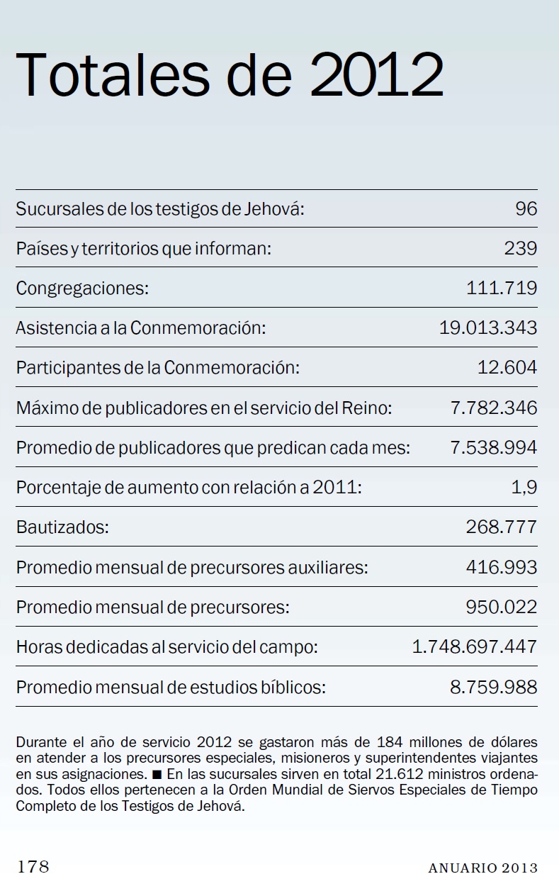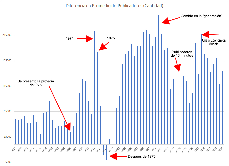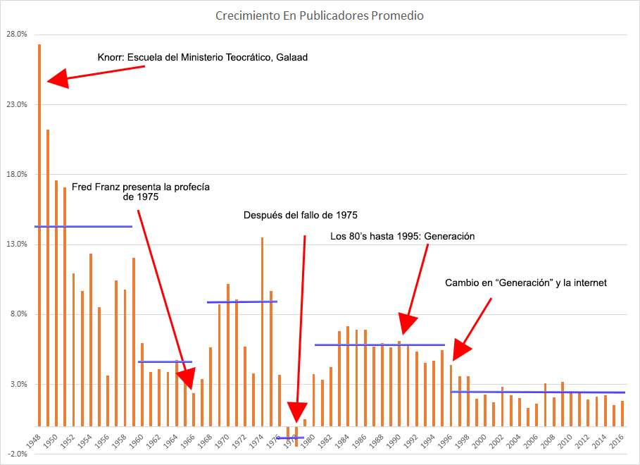 En los 5 años antes de 1975, el número de publicadores crecía en promedio un 9% por año. Durante los años 1980 y al principio de los años 1990, el crecimiento era del 5% al año en promedio. Esto ha bajado al 1-3% ahora... apenas arriba del crecimiento de la población mundial del 1.2%. Un gran número de nuevos publicadores son adolescentes que fueron criados como testigos de Jehová. Esto indica que alrededor de 2 mil millones de horas de predicar solo le traen a la Watchtower suficientes nuevas personas para reemplazar a los hijos de testigos que se salen.