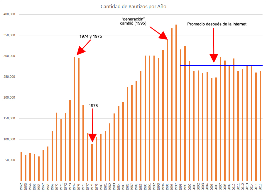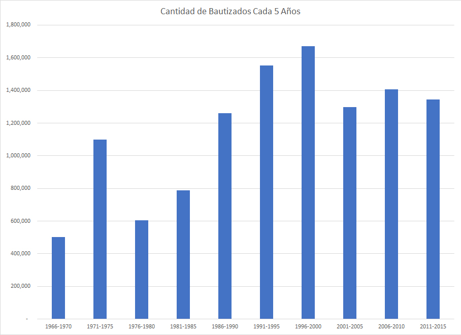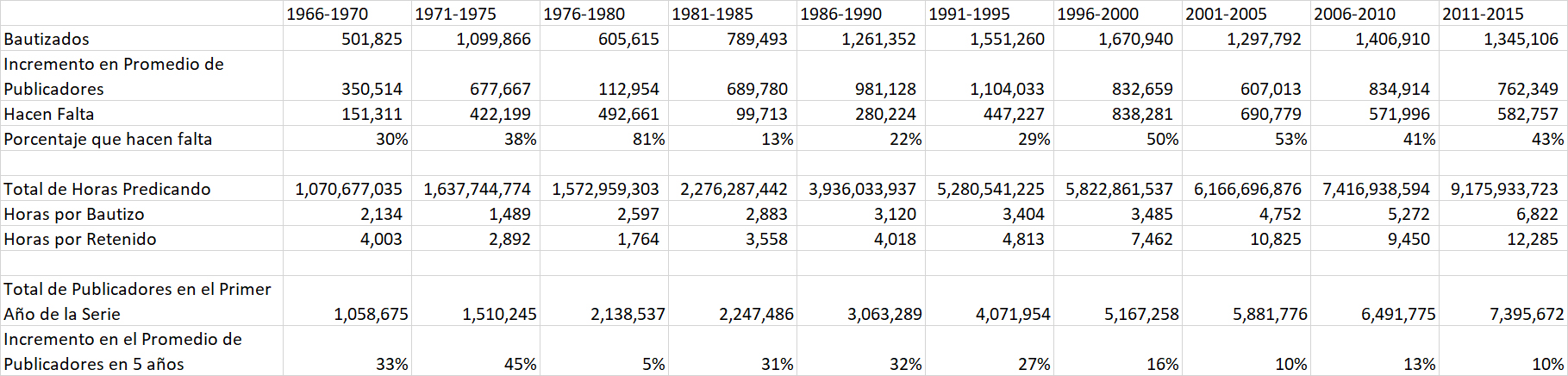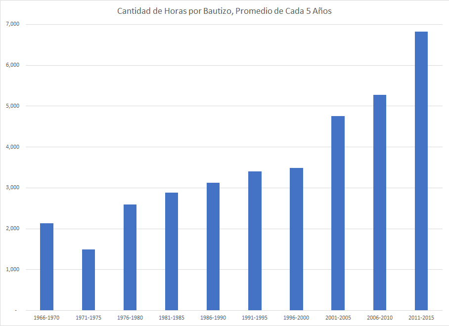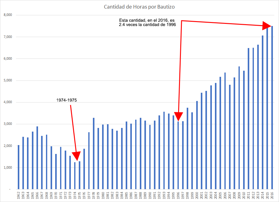 En 1969 había un bautizo por cada 1,983 horas de predicación. Durante los años 1980, este número había subido a 3000 horas. De 1996 al 2016, ¡el número aumentó 2.4 veces la cantidad en 1996 a casi 7500 horas!