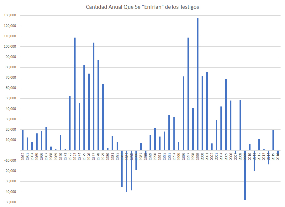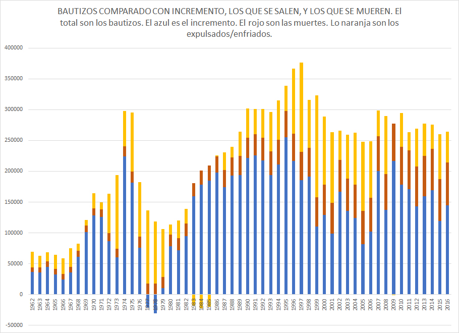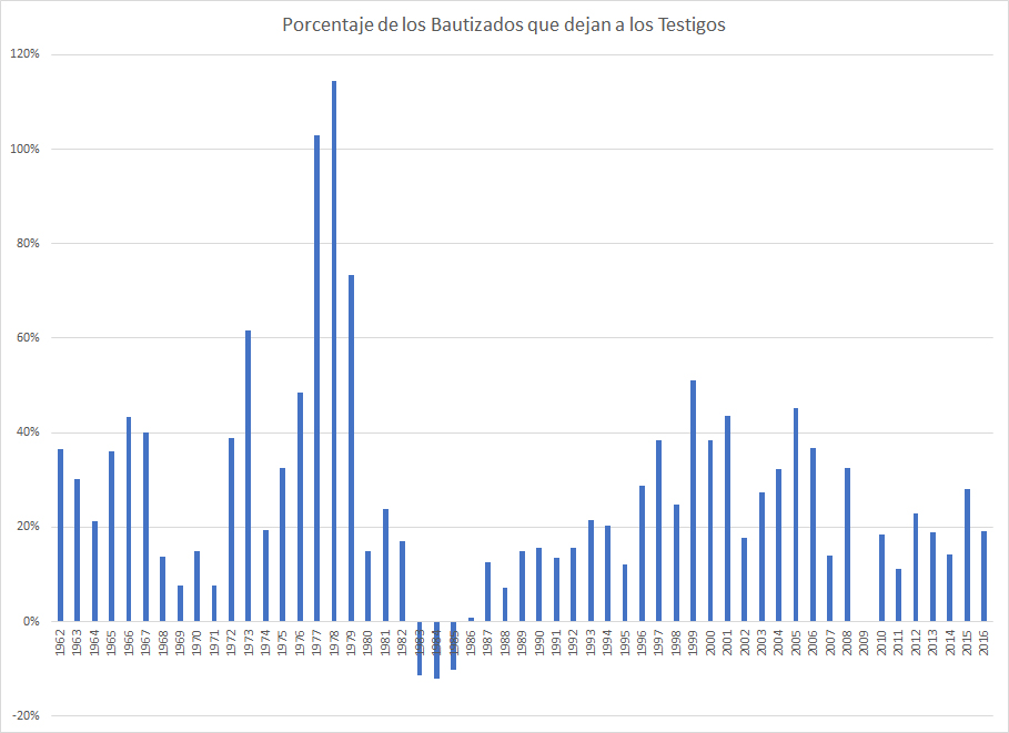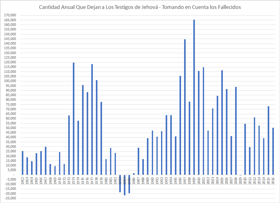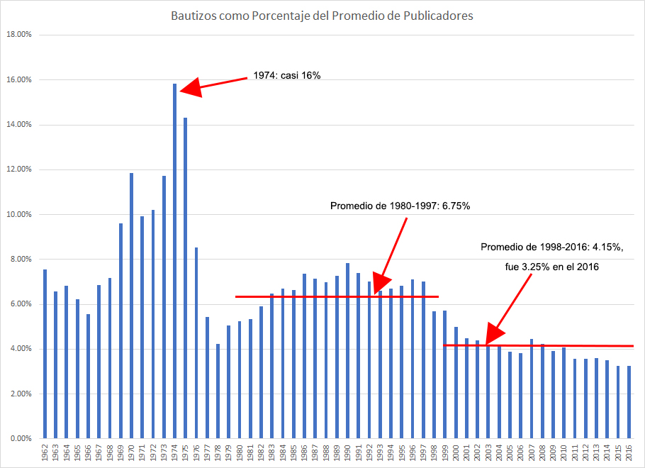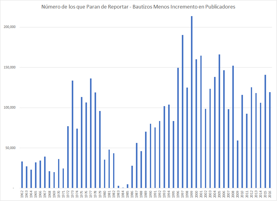 En los 10 años de 1996 al 2005 hubo 2,968,732 bautizados, pero el incremento en publicadores promedio fue de solo 1,439,672. Esto significa que más de 1,529,060 pararon de publicar. Incluso tomando en cuenta la tasa de muerte promedio, más de 1 millón de testigos se salieron en un período de 10 años. Los números son similares para el período del 2006 al 2016, el cual tuvo 2,752,016 bautizados, pero solo un crecimiento de 1,495,504 en publicadores, una pérdida de 1,256,512 publicadores en el período de 10 años.