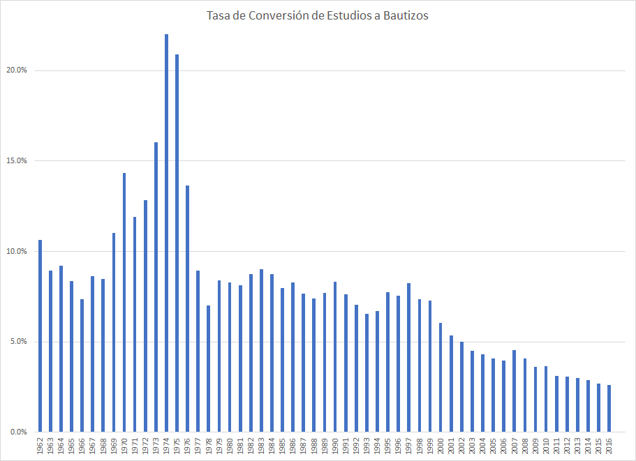 La mayor preocupación del Cuerpo Gobernante ha de ser la tasa de conversión de estudios a bautizos que está bajando estrepitosamente. El número de bautizados dividido entre el número de estudios mensuales ha bajado de un alto de 1 en 5 (22% para ser exactos) antes de 1975, al número de ahora que es solo 1 en 38 (2.6%). Durante los años 1980 y 1990, esta tasa era consistentemente un 8%. Esto ha venido bajando paulatinamente, y fue de tan solo 2.6% en el 2016. (Se debe hacer notar que esta es una tasa comparativa, no exacta, dado que se basa en "estudios Bíblicos mensuales en promedio", y algunos estudios pueden durar por años, mientras que otros por menos de un año).