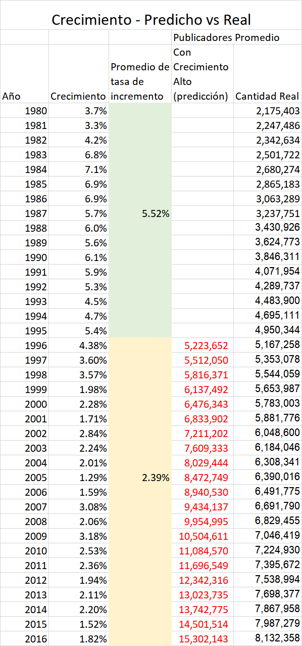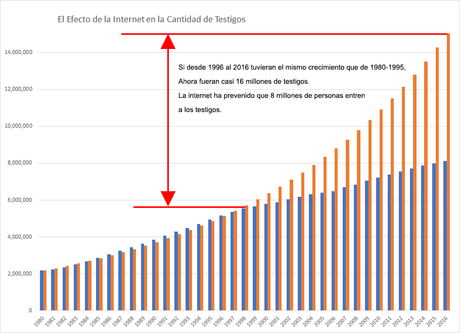 El siguiente gráfico muestra la consecuencia de la disminución en el crecimiento de los testigos de Jehová, y poderosamente muestra el efecto del crecimiento compuest. De 1980 a 1995, la tasa de crecimiento promedio fue del 5.52% por año. De 1996 al 2016, la tasa de crecimiento promedio fue del 2.39%. Si el crecimiento hubiera continuado igual a los años anteriores, habrían más de 15.5 millones de testigos en el 2016. En vez de eso, son apenas un poco más de 8 millones de personas en el 2016... una diferencia de 7.5 millones de personas. En vez de duplicarse para el 2016, solo crecieron en unos 2 millones de personas desde 1995. La internet y otros factores resultaron en una reducción de crecimiento del 75%.