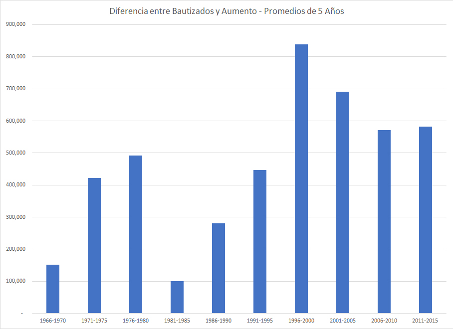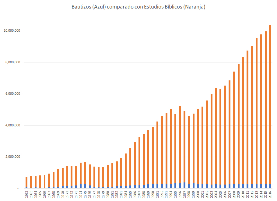 Impresionantemente, el número de bautizos se queda cerca del doble del crecimiento de publicadores, lo que significa que por cada dos personas que se bautizan, aproximadamente 1 publicador se va.