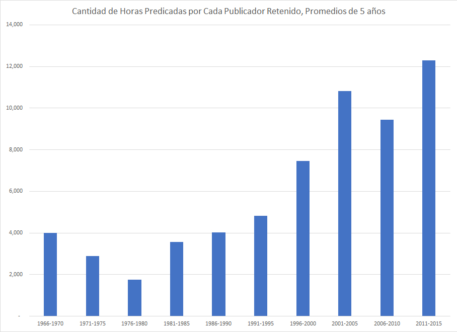 Más importante es el número de horas requeridas para un publicador adicional. Dado el hecho que hay una cantidad cada vez mayor de gente saliéndose de los testigos, la cantidad de horas necesarias para retener a un publicador adicional se ha cuadruplicado de 4,000 al principio de los 90's hasta 16,000 en el 2015.