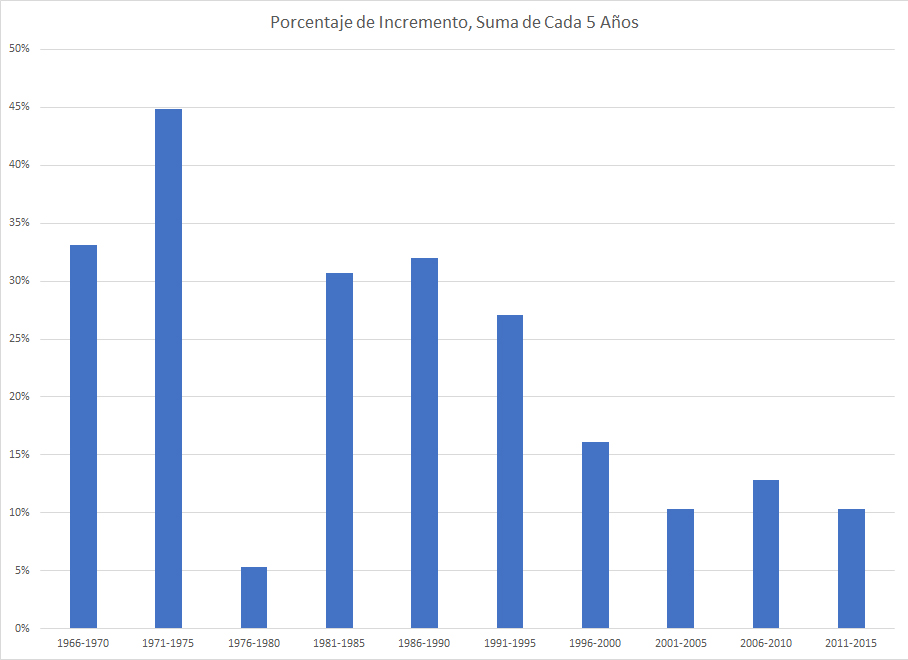Los porcentajes de crecimiento más altos fueron en los años 70, y los crecimientos numéricos más altos fueron en los años 90. Los números de a largo plazo muestran un descenso dramático en las tasas de crecimiento en porcentaje cuando se compara los primeros años de los 70's con el siglo 21.