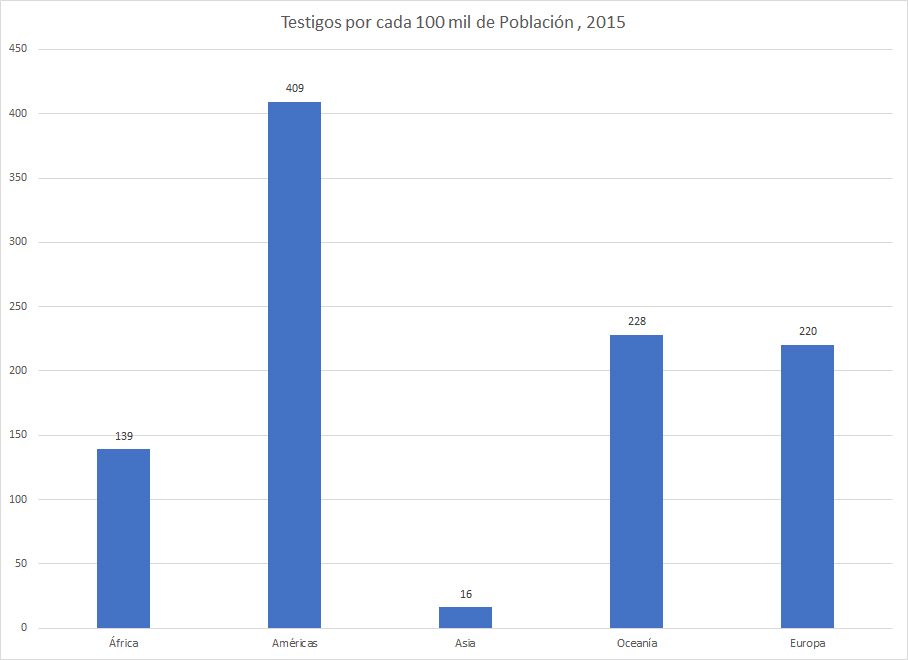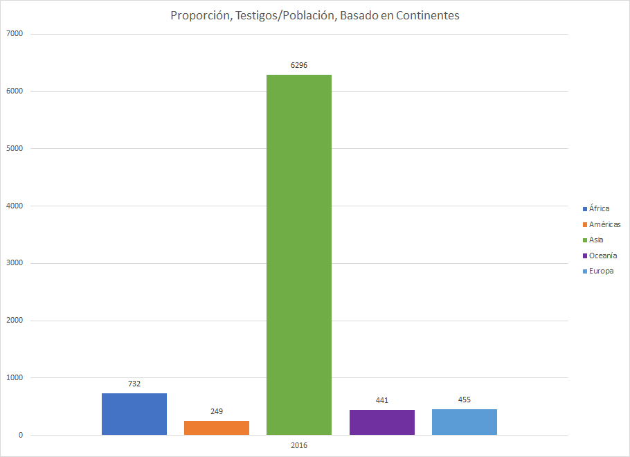 En el área hindú/musulmana de Asia o el Medio Oriente, existe una fracción enana de personas que son testigos de Jehová, y esto se ve en la altísima columna verde. A pesar de que hay 4 mil millones de personas en Asia y el Medio Oriente, generalmente los testigos sólo crecen por unas mil personas al año.